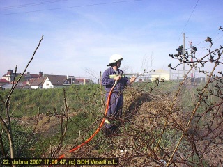 Při příjezdu na místo zásahu jednotka zjistila průzkumem, že se jedná o požár suché trávy na náspu železniční trati na ploše cca 50 x 10 metrů. Požár se šířil na obě strany po náspu. Pomocí jednoho proudu vysokotlaké vody byl požár lokalizován. Následně jedním proudem C bylo provedeno dohašení a ulití doutnajících míst. Po likvidaci se jednotka vrátila na základnu. Technika: CAS-32 Tatra 815, vyhlášení poplachu 16.47, výjezd jednotky 16:53, návrat na základnu 17:28, zasahovali 4 členové zásahové jednotky.