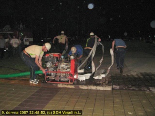 Při 6.ročníku noční soutěže O pohár starosty města se soutěžilo v obou kategoriích na 2B, široké hadice a nástřikové terče. Z pravidla, že stroj smí být o maximálním obsahu motoru 1250 ccm, si nikdo nic moc nedělal a tak jsme v záplavě výkonnějších mašin moc šancí na přední umístnění neměli. Jako první se z našich týmů na start postavilo družstvo B, opět v poslepované sestavě, v obsazení koš Jiří Janák, savice Karel Horváth, stroj František Zimmel, béčka Petr Šimonovič, rozdělovač Stanislav Kaisler, levý proud Michal Suchý a pravý proud Josef Nečas. Nadějný pokus pokazil velmi špatný nástřik, nicméně ani tak nebyl výsledný čas na naše poměry vůbec špatný.