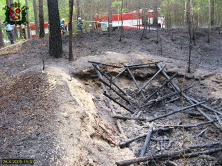 Po příjezdu na místo události naše jednotka zjistila, že se jedná o požár dřevěného srubu a okolního lesa v prostoru bývalé pískovny u silnice z Mažic do Vesců. Na místě již zasahovala jednotka HZS Soběslav s CAS-32 Tatra 815, požár již byl lokalizován. Napojili jsme naší CAS-32 Tatra 815 jednou hadicí B na soběslavskou T-815 a postupně jsme ji doplňovali vodou. Na místo se také dostavila JSDHO Dolní Bukovsko s CAS-32 Tatra 148 a CAS-25 Škoda 706, ale byla hned velitelem zásahu odeslána na základnu. Členové naší jednotky pomáhali na C proudech HZS Soběslav s hašením a při úklidu materiálu. Po příjezdu vyšetřovatele HZS byla naše jednotka velitelem zásahu odeslána na základnu.