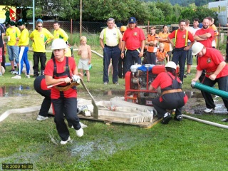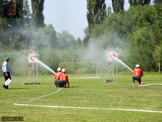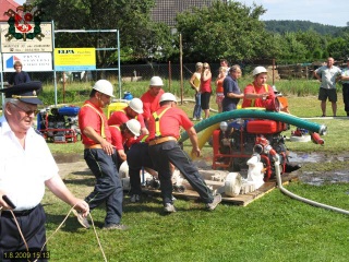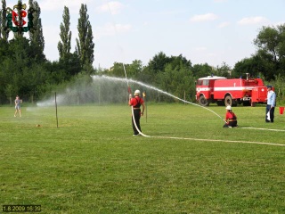 Pak již následoval tradiční „kulturní“ program – podvečerní koupel v nedalekém lomu a taneční zábava na miřetickém parketě. Stejně jako loni hrála skupina MAT 4 a zábava se protáhla až do ranních hodin.. Po budíčku a snídani se někteří koupel v lomu zopakovali a pak již následovalo rozloučení s našimi hostiteli, kteří se o nás perfektně postarali a cesta k domovu. S našimi přáteli se opět uvidíme v září, kdy nám návštěvu oplatí při Memoriálu Josefa Žahoura v našem městě. ![]() POŽÁRNÍ ÚTOK – MUŽI