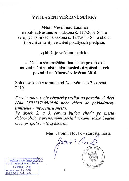 Veselí vyhlašuje povodňovou sbírku na pomoc Moravě25. května 2010, Obec , přečteno 4344x, komentováno 2x