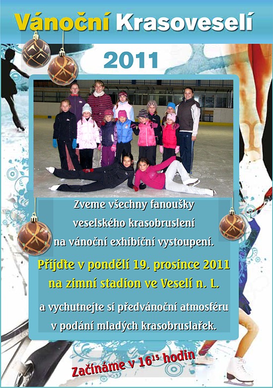Zveme všechny fanoušky veselského krasobruslení na vánoční exhibiční vystoupení. Přijďte v pondělí 19. prosince 2011 na zimní stadion ve Veselí n. L. Začínáme v 16:15h